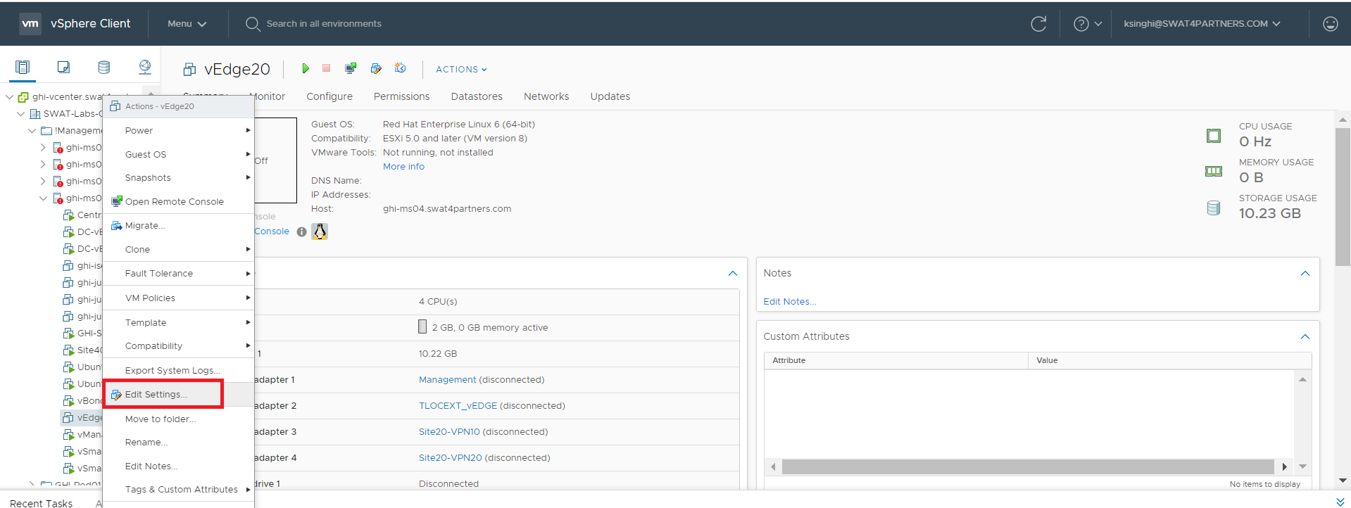 Once the VM is deployed, right click vEdge20-podX and click Edit settings.
