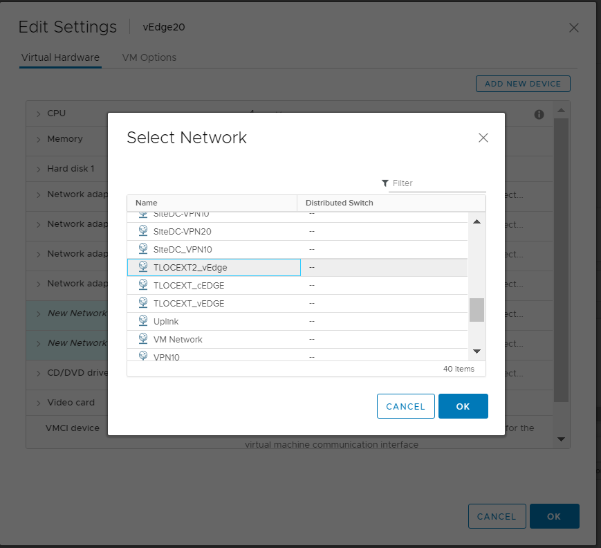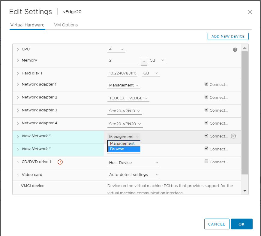 Click on the drop down for the second New Network entry, added as a result of adding two network adapters and click on Browse. Select the TLOCEXT2_vEdge Network