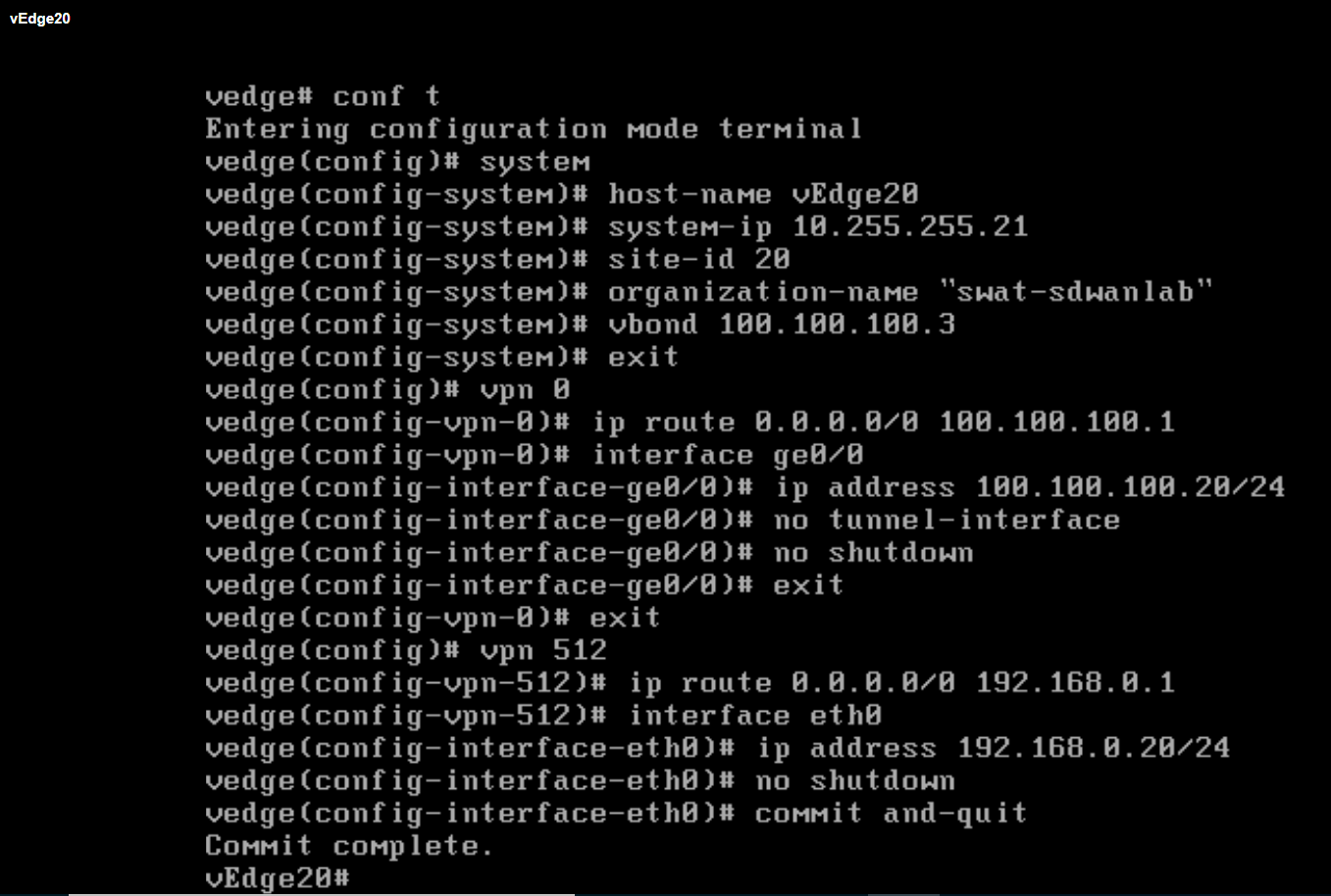 conf t system host-name vEdge20 system-ip 10.255.255.21 site-id 20 organization-name "swat-sdwanlab" vbond 100.100.100.3 exit ! vpn 0 ip route 0.0.0.0/0 100.100.100.1 interface ge0/0 ip address 100.100.100.20/24 no tunnel-interface no shutdown exit ! exit ! vpn 512 ip route 0.0.0.0/0 192.168.0.1 interface eth0 ip address 192.168.0.20/24 no shutdown ! commit and-quit