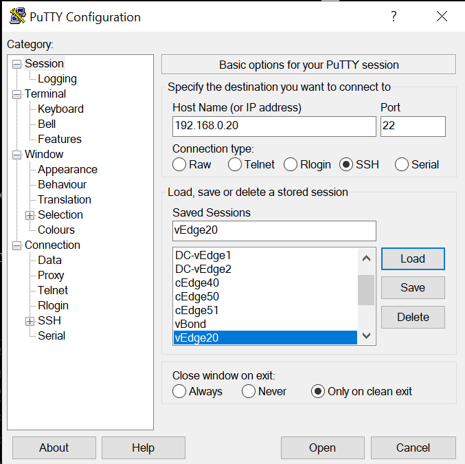 Open Putty and double-click the saved session for vEdge20 (or SSH to 192.168.0.20)