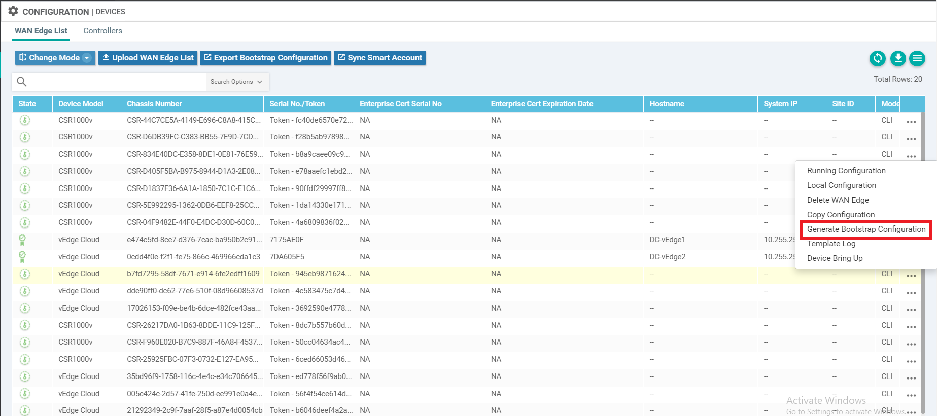 Choose any vEdge Cloud device (it doesn’t matter which one you pick, as long as it is a vEdge Cloud) and click on the three dots at the extreme right-hand side. Choose to Generate Bootstrap Configuration