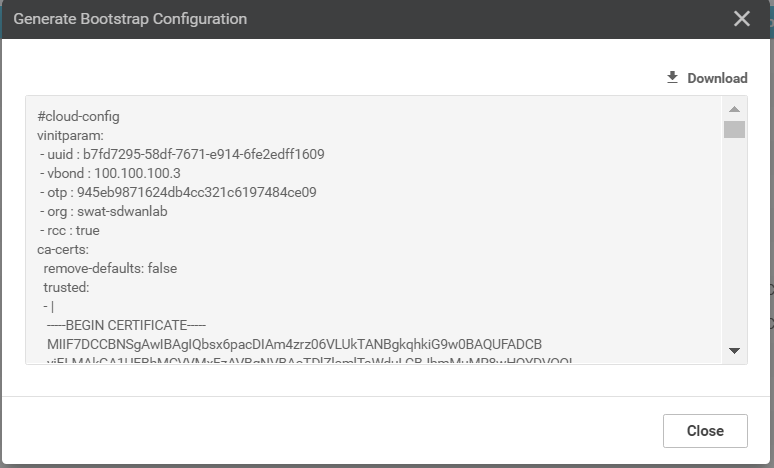 Make note of the UUID and the OTP values. These will be required to activate the vEdge. It’s best to copy the string and place it in notepad, since we will need to use it in our SSH session to the vEdge20 device. Alternatively, leave this popup open and we can come back to it when required