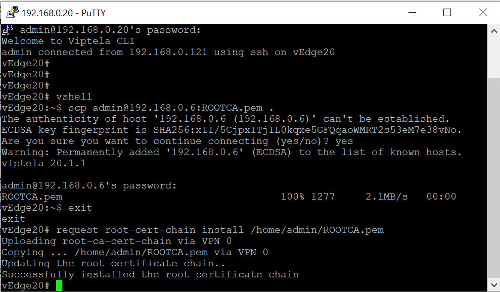 to copy the ROOTCA.pem certificate to the vEdge. Commands can be copy-pasted now since we have SSH’d in to the vEdge (there is a dot at the end of the scp command). Enteryes