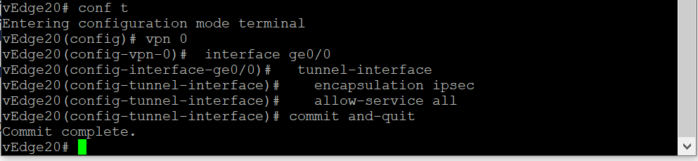 in order to write the configuration changeconfig t vpn 0 interface ge0/0 tunnel-interface encapsulation ipsec allow-service all exit ! commit and-quit