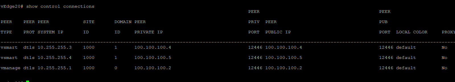 in the vEdge20 CLI. We should see that the vEdge has been able to establish a DTLS tunnel with the vManage and the vSmarts. If you don’t see any output, wait for a couple of minutes and run the command againshow control connections
