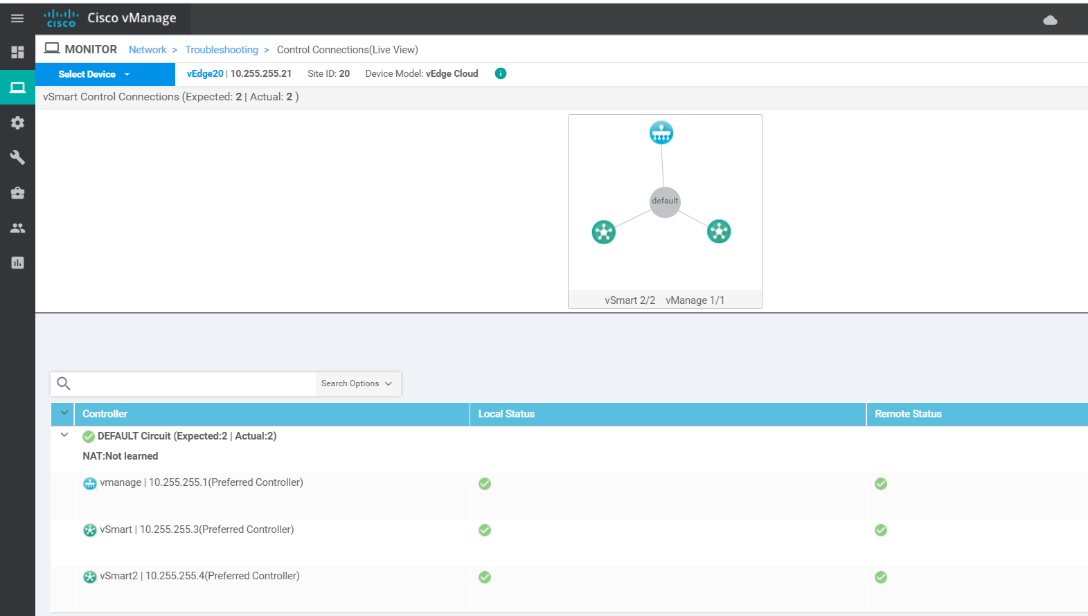 Click on vEdge20 and navigate to Troubleshooting => Control Connections(Live view). You should see the vEdge successfully connected to 2 vSmarts and 1 vManage