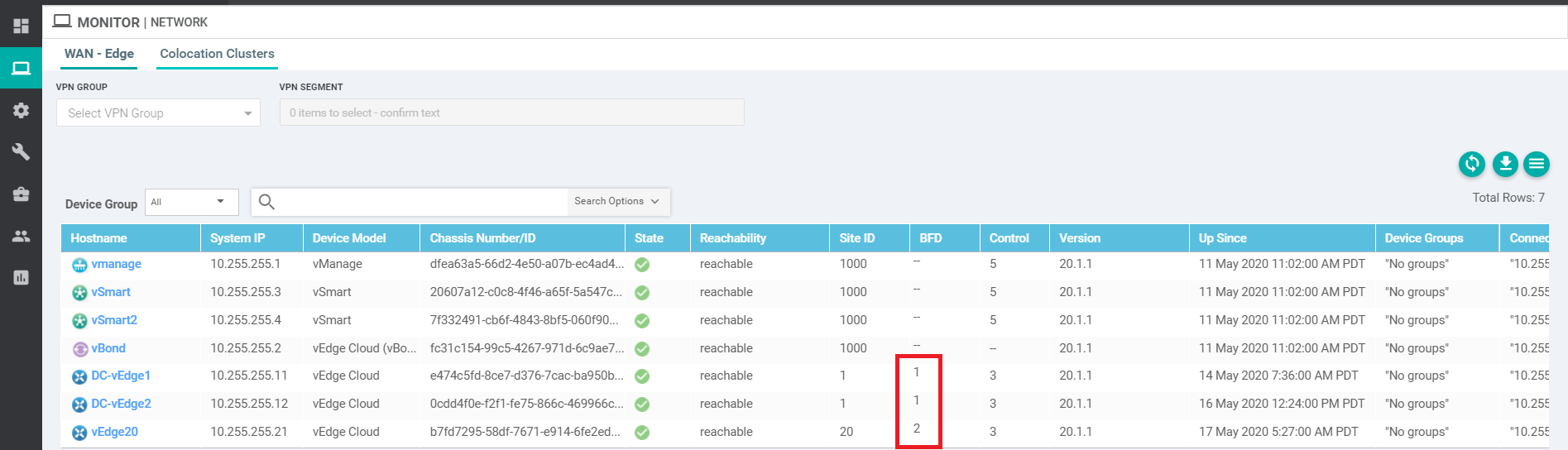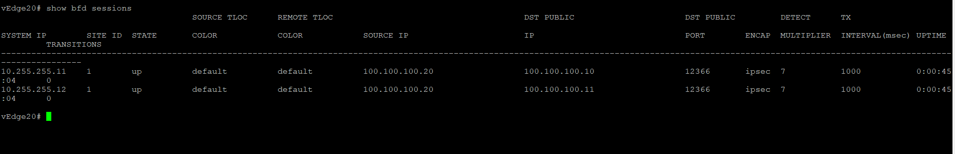 This can be verified from the Monitor => Network page as well, where we will see active BFD sessions on all devices. Via CLI, this can be checked using